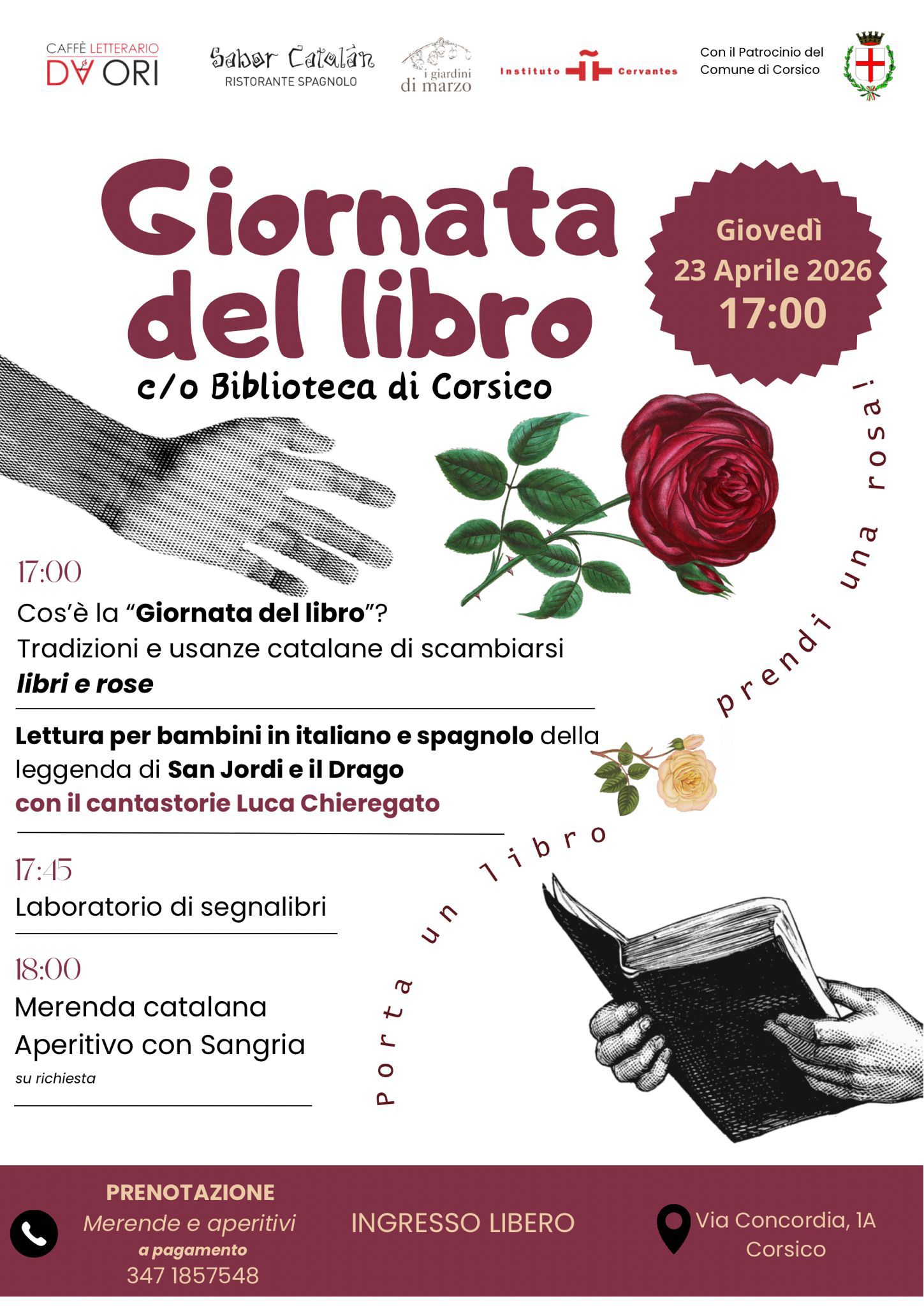 Per celebrare la Giornata del Libro, giovedì 23 aprile sono in programma diversi eventi, alla Biblioteca Sul Naviglio di Corsico (via Concordia 1/A). A partire dalle ore 17, letture per bambini in italiano e spagnolo della leggenda di San Jordi e il Drago, con il cantastorie Luca Chieregato. Alle ore 17.45, laboratorio di segnalibri e alle 18 merenda catalana e aperitivo (a pagamento, su prenotazione). Ingresso libero