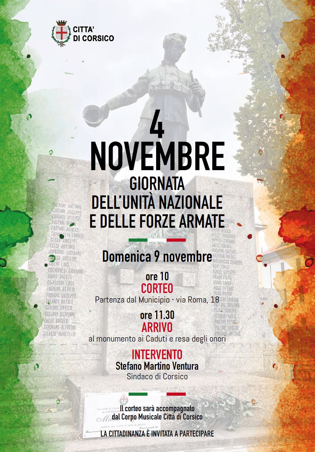 Accompagnato dal Corpo musicale Città di Corsico, alle ore 10.00 il corteo partirà dal Municipio di via Roma 18 per arrivare intorno alle 11.30 al Monumento ai Caduti, in via Vittorio Emanuele II, al cui ricordo verranno resi gli onori e dove interverrà il Sindaco di Corsico Stefano Martino Ventura.