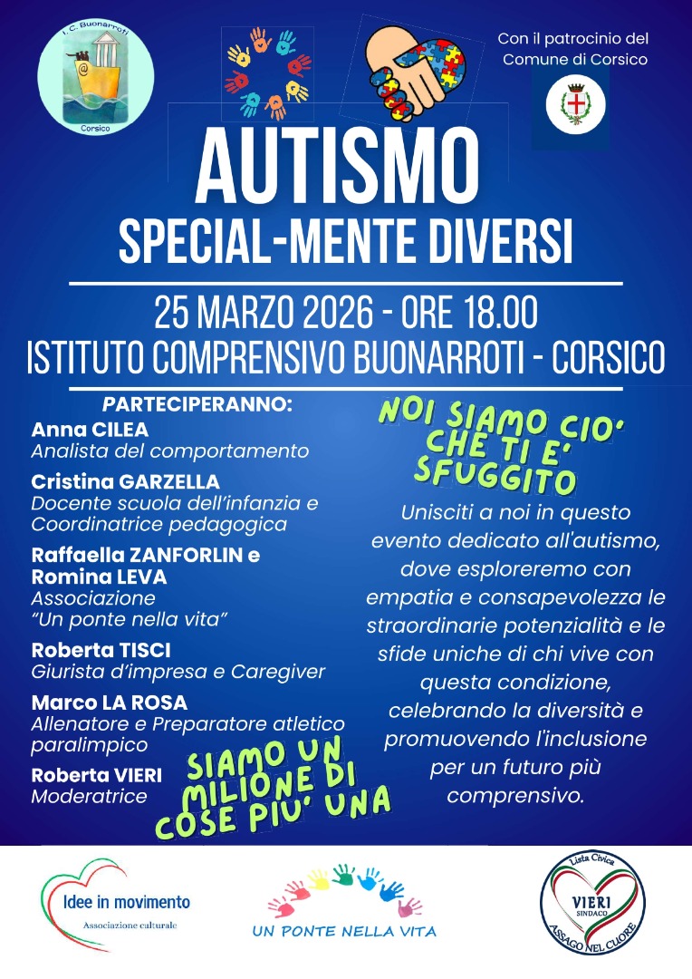 L’istituto Comprensivo “Buonarrotti” organizza ed ospita con il patrocinio del Comune di Corsico un evento dedicato all’autismo, ove valorizzare la diversità e promuovere l’inclusine sociale. Si esploreranno con empatia e consapevolezza le risorse e potenzialità di chi vive questa condizione.