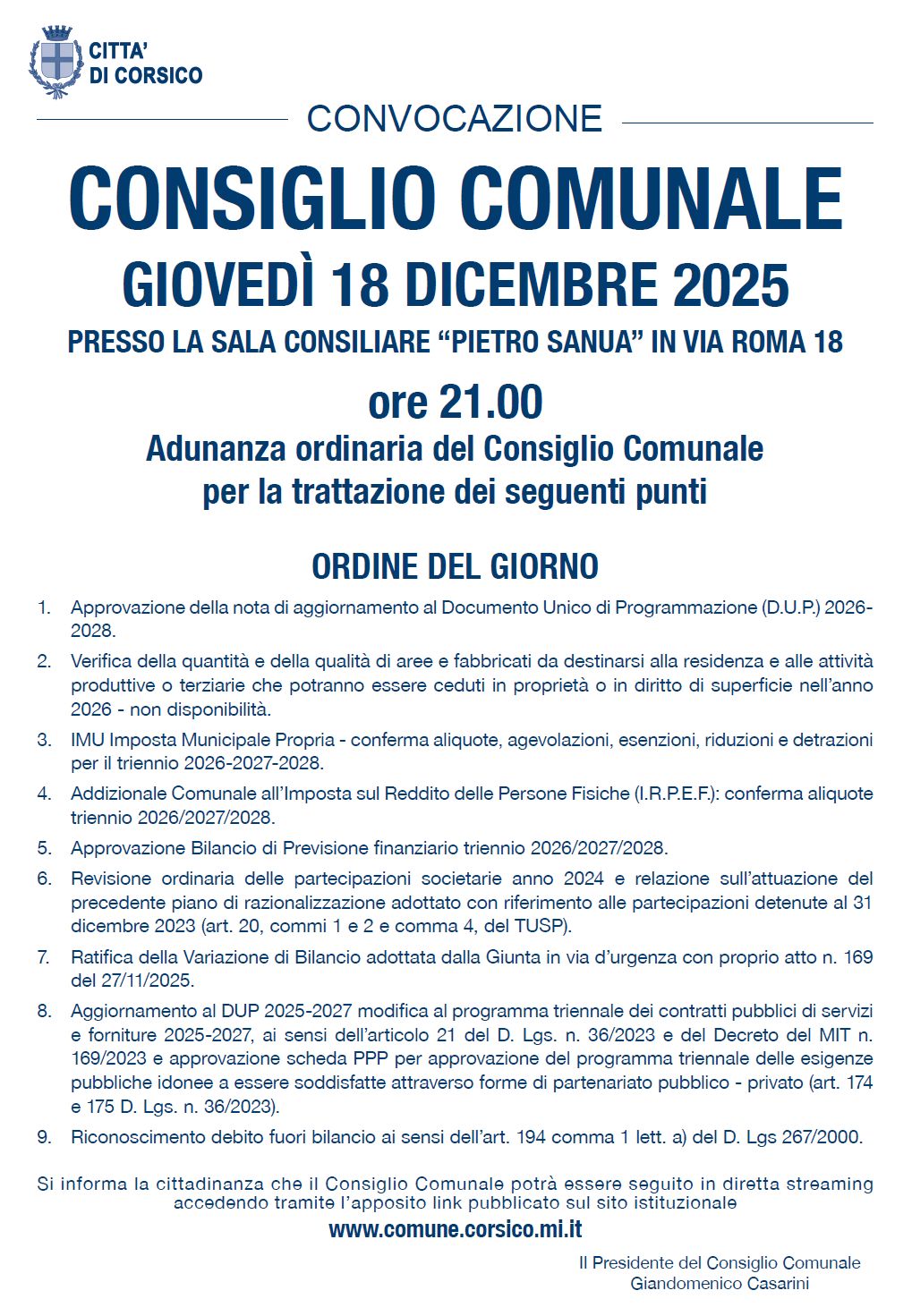 Giovedì 18 dicembre 2025 alle ore 21.00, presso la Sala consiliare “Pietro Sanua”, in via Roma 18, è convocata l’Adunanza ordinaria del Consiglio Comunale.