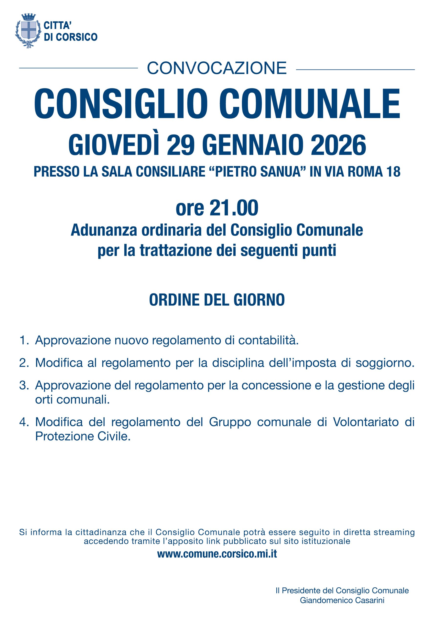 Giovedì 29 gennaio 2026 alle ore 21.00, presso la Sala consiliare “Pietro Sanua”, in via Roma 18, è convocata l’Adunanza ordinaria del Consiglio Comunale.