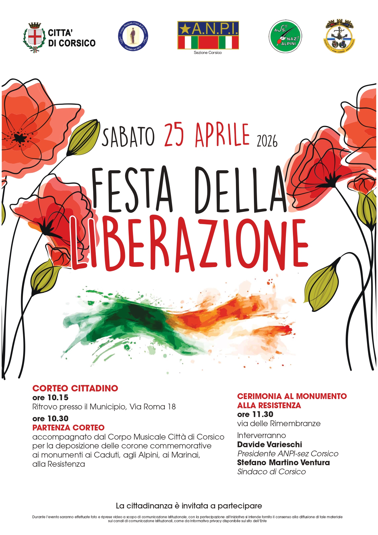 La città di Corsico si prepara a celebrare il 25 aprile, Festa della Liberazione, con una mattinata dedicata alla memoria storica. L’amministrazione comunale, in collaborazione con la sezione locale ANPI, Associazione Nazionale Alpini, l’Associazione Nazionale Marinai, invita tutta la cittadinanza a partecipare alle celebrazioni ufficiali.