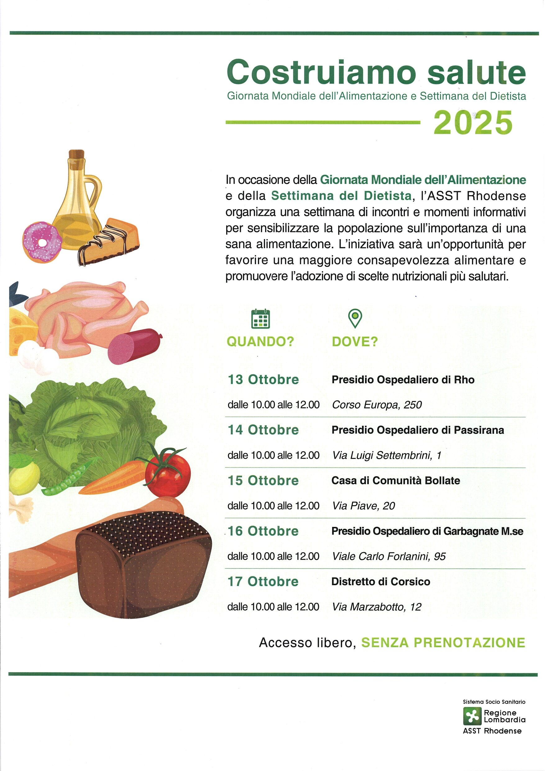 In occasione della Giornata Mondiale dell’Alimentazione e della Settimana del Dietista, l’ASST Rhodense, dal 13 al 17 ottobre 2025, organizza una settimana di incontri e momenti informativi per sensibilizzare la popolazione sull’importanza di una sana alimentazione.