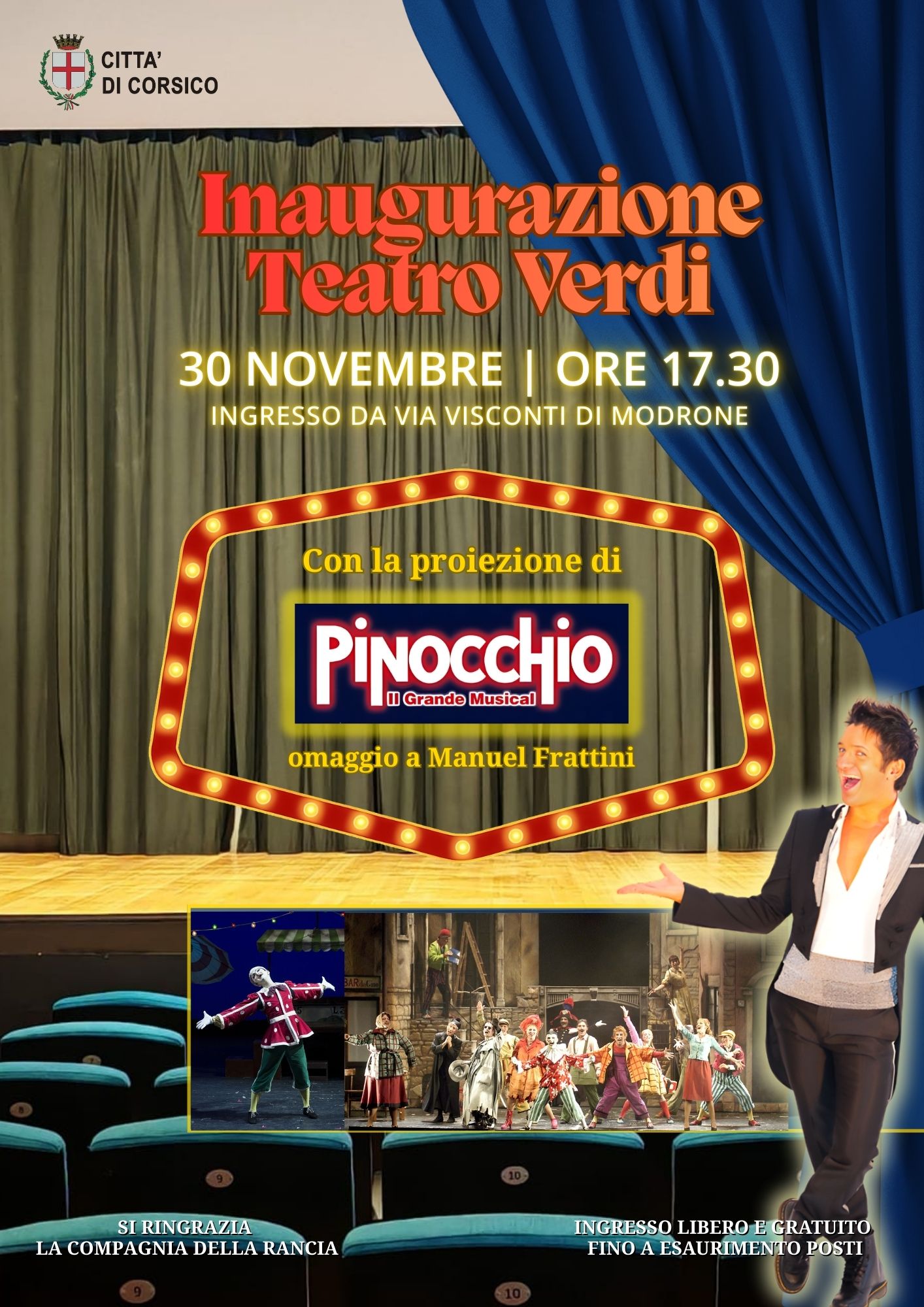 In occasione della riapertura verrà proiettato il bellissimo spettacolo “Pinocchio. Il Grande Musical”: un omaggio all’indimenticato Manuel Frattini, attore di Corsico di grande talento, prematuramente scomparso nel 2019.