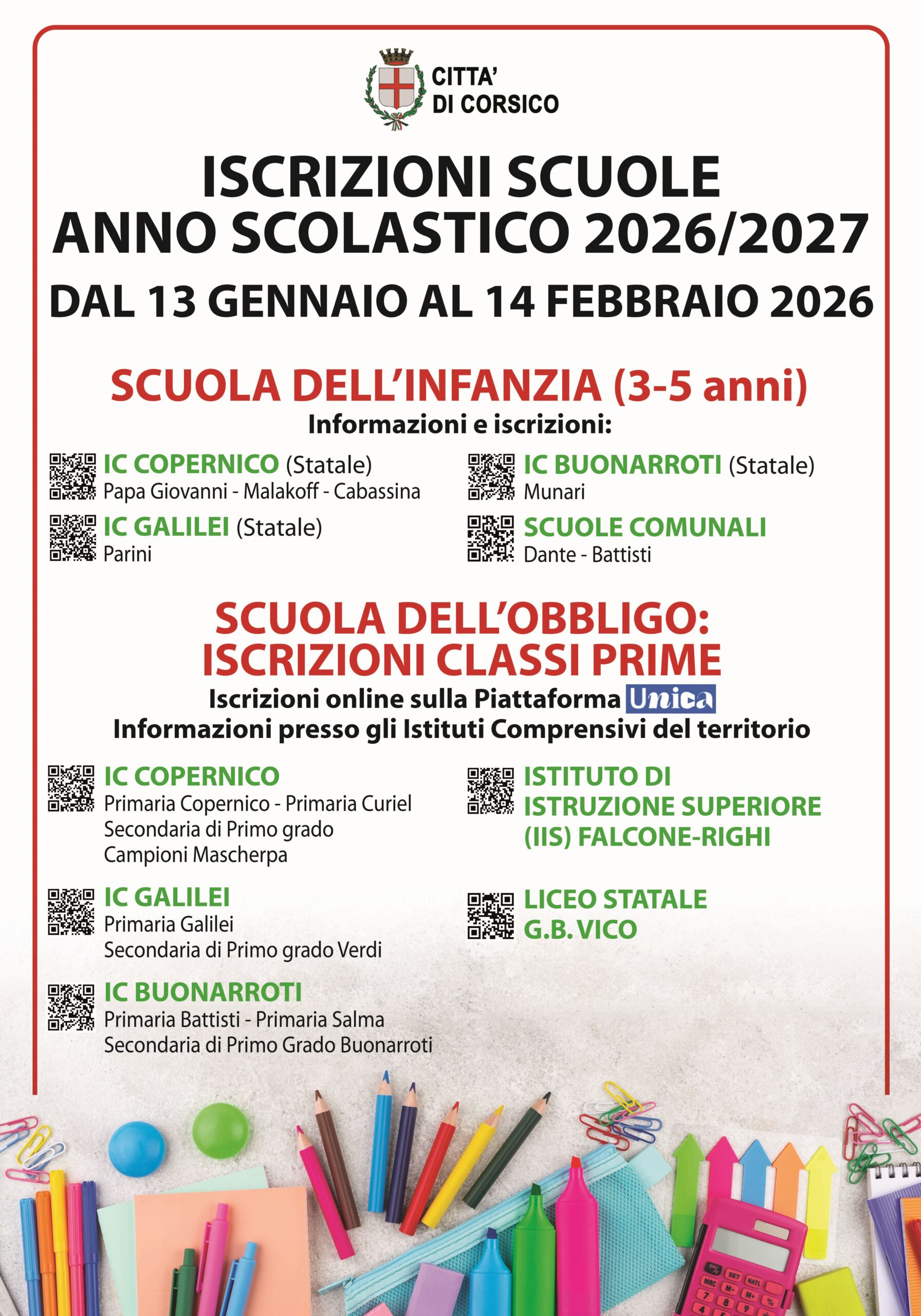 Come da nota del Ministero dell’Istruzione e del Merito del 17 dicembre 2025 dalle ore 8.00 del 13 gennaio 2026 alle ore 20.00 del 14 febbraio 2026 saranno aperte le iscrizioni alle prime classi per l’anno scolastico 2026/2027.