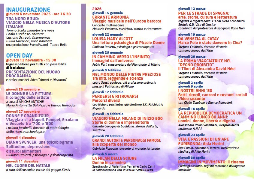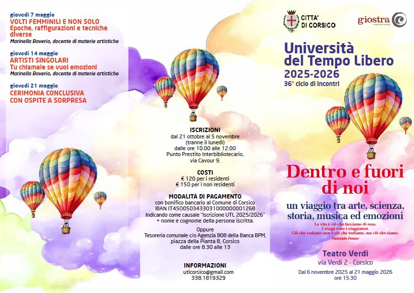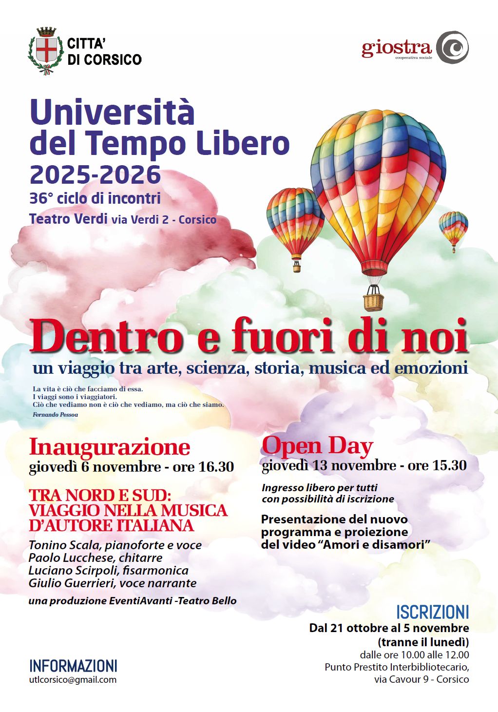 Il 36° ciclo di incontri, dal 6 novembre 2025 con l’inaugurazione al 21 maggio 2026 con la cerimonia conclusiva, si intitolerà “Dentro e fuori di noi”, un viaggio tra arte, scienza, storia, musica ed emozioni e si svolgerà ogni giovedì alle ore 15.30 presso il Teatro Verdi, in via Verdi 2 a Corsico.