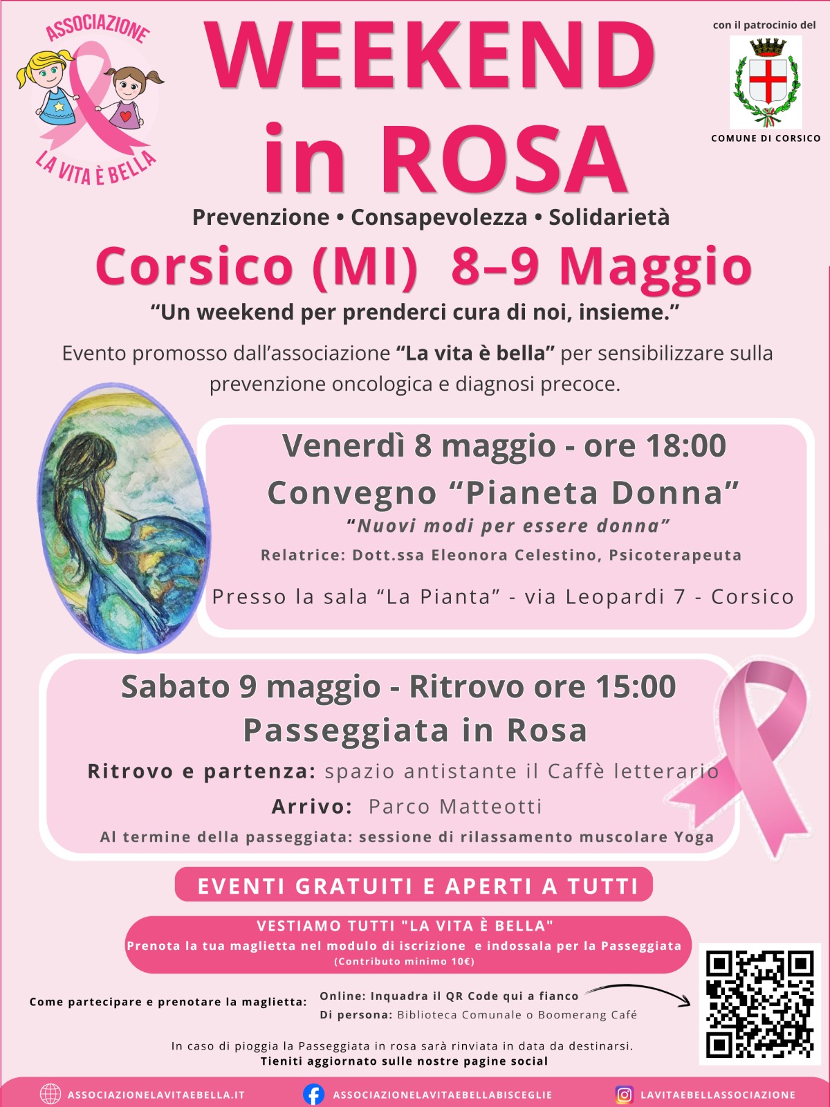 L’associazione La Vita è Bella, con il patrocinio del Comune di Corsico, invita la cittadinanza a partecipare al Weekend in Rosa. Due giorni pensati per sensibilizzare sulla prevenzione oncologica e la diagnosi precoce.